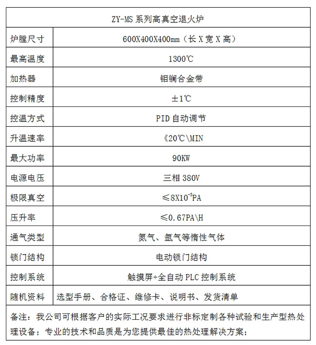 產(chǎn)品簡(jiǎn)介:該設(shè)備ZY-MS1300-80-96將真空/氣氛、高溫?zé)Y(jié)結(jié)合在一起,是我公司專(zhuān)門(mén)為3D金屬打印行業(yè)(SLS\SLM)研發(fā)的一款高真空退火爐;主要應(yīng)用于鈦合金、特種不銹鋼等航空航天領(lǐng)域的3D增材金屬材質(zhì)的退火工藝;該設(shè)備能在熱處理過(guò)程中消除金屬打印中的應(yīng)力,讓材料性能更佳;并且能有效保證產(chǎn)品不被氧化,也沒(méi)有任何污染;合理結(jié)構(gòu)及控制系統(tǒng)設(shè)計(jì)可以讓生產(chǎn)更加安全高效,節(jié)省人力及工藝成本、提高生產(chǎn)效率;